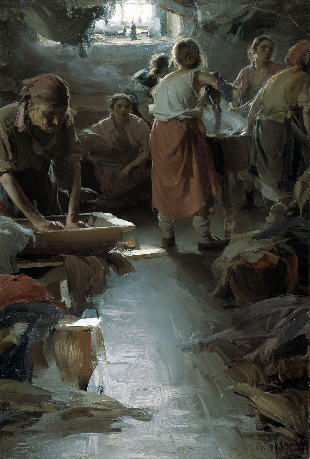 Отдельная тема в творчестве Абрама Архипова посвящена тяжёлому труду подёнщиц, прачек и крестьянок. Рассказанная Евсеевой Екатериной история создания двух произведений с одноимённым названием «Прачки» подчёркивает, с каким вниманием художник обращался к композиционному решению картин, его внимание к деталям и к крестьянским образам, выписанным с душой и личным отношением к тяжёлому бабьему труду. Судьба многих больших полотен остаётся неизвестна, но этюды к этим работам дают нам представление о том, какие это были картины. В частности, очень тонкий по живописи этюд «Подёнщицы на чугунно-литейном заводе» (1895) - отрывок полотна, который на передвижных выставках вызывал большой успех.